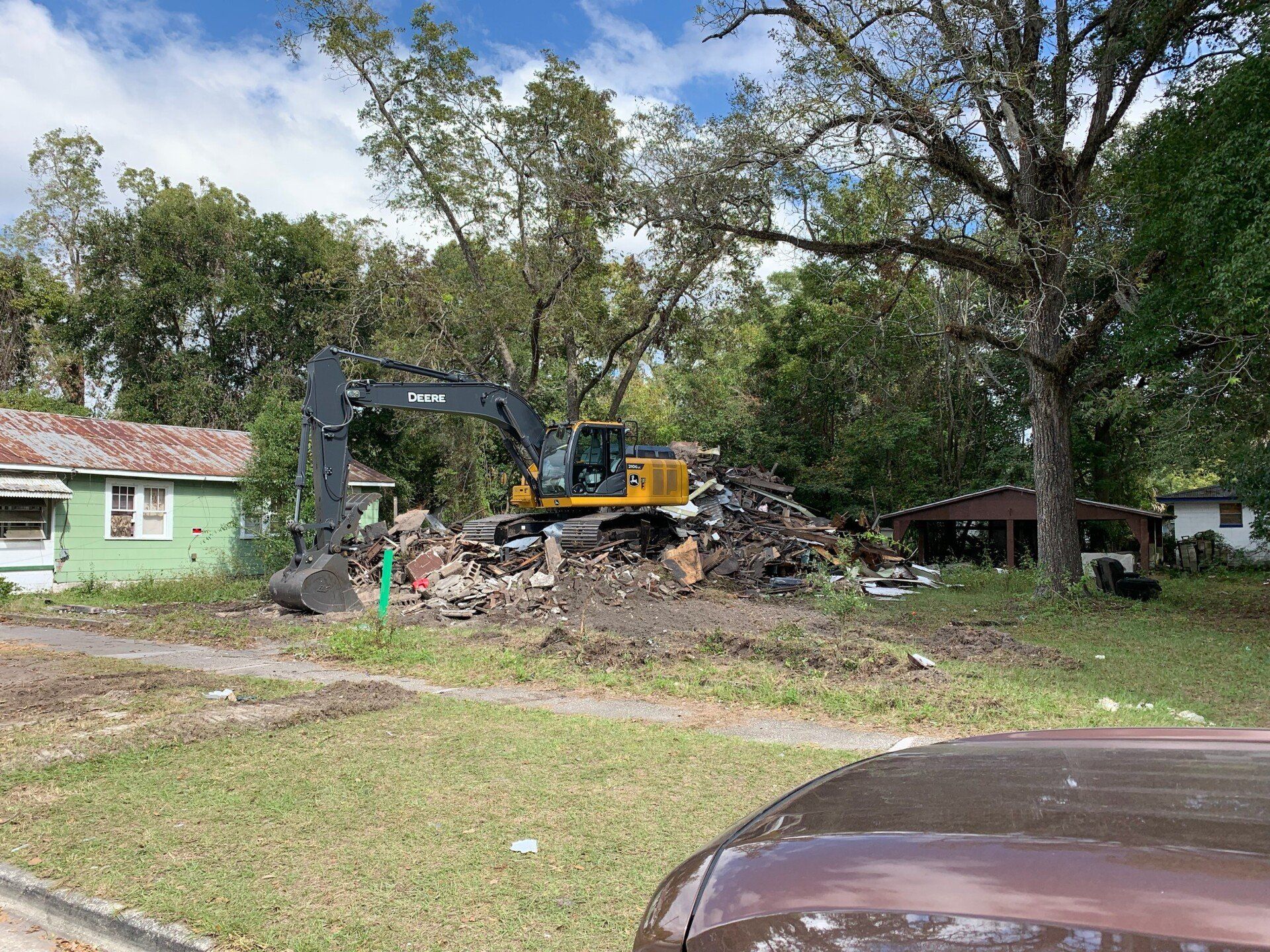 We have a 60-yard grapple truck, dump trailers, and excavators perfect for tearing down sheds and trailers to larger jobs. Once we complete demolishing, we’ll pick up and remove the remaining debris.